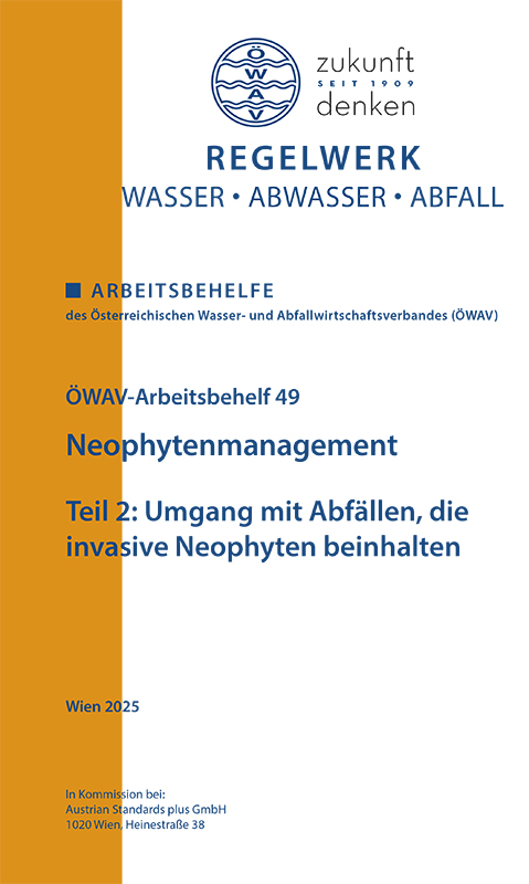 ÖWAV-Regelblatt 405: Arbeitshygienische und arbeitsmedizinische Richtlinien für Abwasseranlagen ÖWAV-Arbeitsbehelf 49 (2): Neophytenmanagement. Teil 2: Umgang mit Abfällen, die invasive Neophyten beinhalten ÖWAV-Tätigkeitsbericht 2024/25 ÖWAV-Merkblatt: Befahren (Ein- und Aussteigen) von Behältern, Schächten, Kanälen, Dükern und dgl. und Durchführen von Arbeiten in solchen Einrichtungen (§§ 23a, 23b Arbeitsmittelverordnung – AM-VO) ÖWAV-Positionspapier: Die Rolle der Abfallwirtschaft in der Kreislaufwirtschaft Wasservision 2100 – Wasser als Ressource der Zukunft