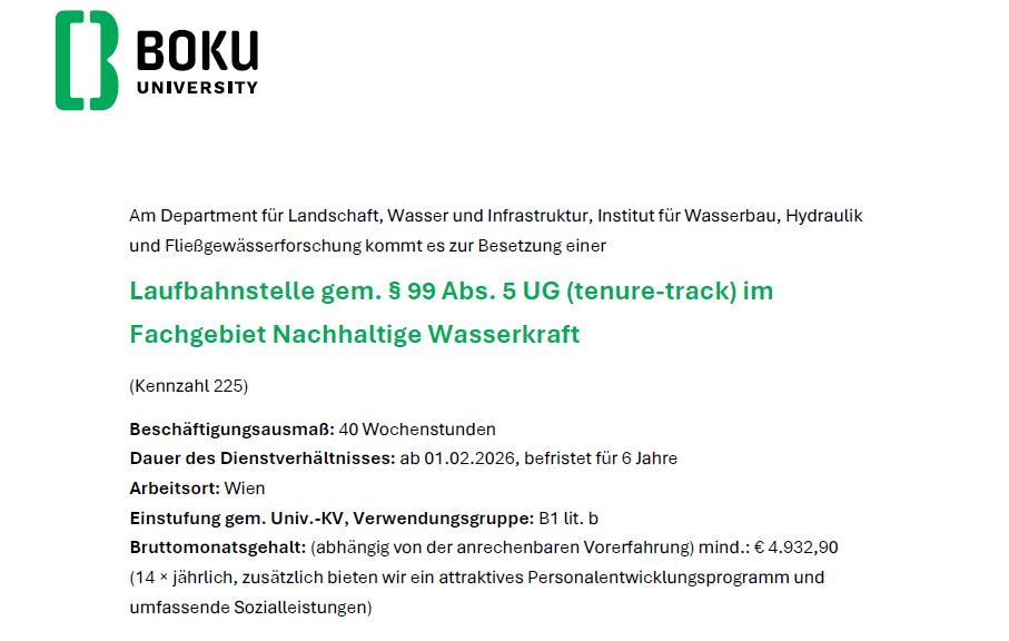 BOKU-Ausschreibung: Laufbahnstelle "Nachhaltige Wasserkraft" Am Department für Landschaft, Wasser und Infrastruktur, Institut für Wasserbau, Hydraulik und Fließgewässerforschung an der Universität für Bodenkultur kommt es zur Besetzung einer Laufbahnstelle gem. § 99 Abs. 5 UG (tenure-track) im Fachgebiet "Nachhaltige Wasserkraft". "Mikroplastik - eine aktuelle Herausforderung?" Am 19. November 2025 fand in Wien das ÖWAV-Seminar „Mikroplastik – eine aktuelle Herausforderung?“ statt. Umweltmediziner Hans-Peter Hutter sprach in seiner Keynote über "Living in a material world...". UVP-Recht in der Praxis 2025 Die diesjährige Fachtagung „UVP-Recht in der Praxis“ wurde am 13. November 2025 im Cape 10 abgehalten und bestätigte einmal mehr die hohe Dynamik des UVP-Rechts.