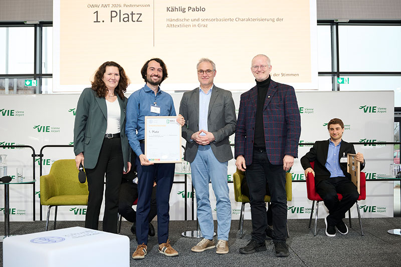 Im Rahmen der Abfallwirtschaftstagung 2026 wurde auch wieder die traditionelle Postersession abgehalten. Pablo Kählig (TU Wien) konnte das Rennen mit seinem Projekt über Alttextilien für sich entscheiden.