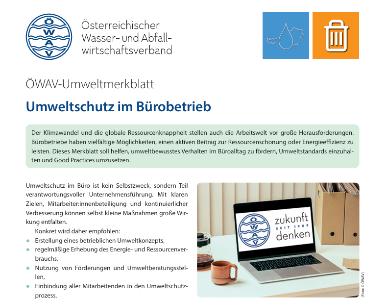 Umweltschutz im Büro ist ein zentrales Thema, der ÖWAV hat dazu ein praxisorientiertes Merkblatt herausgebracht, das ab sofort kostenlos zum Download zur Verfügung steht.